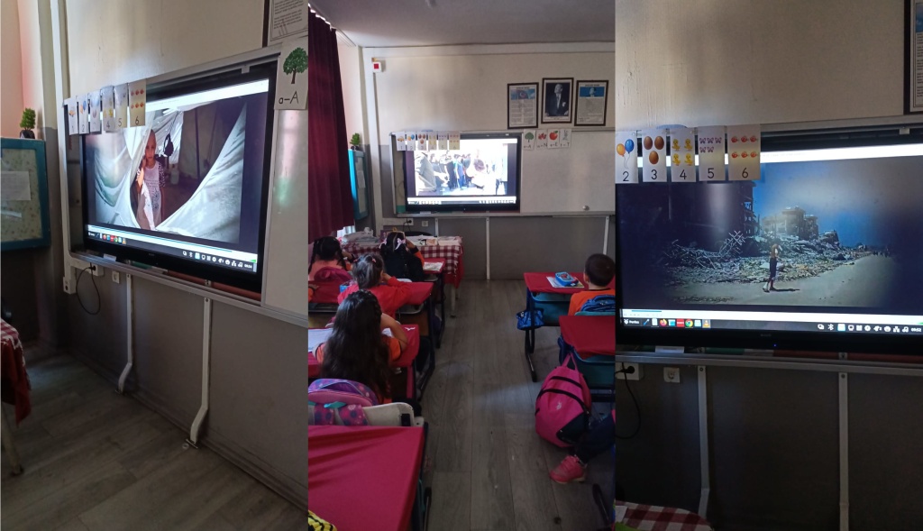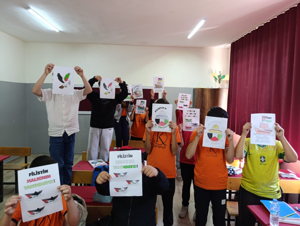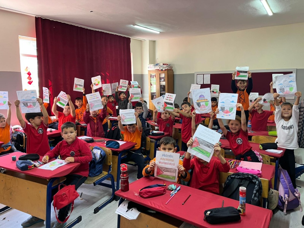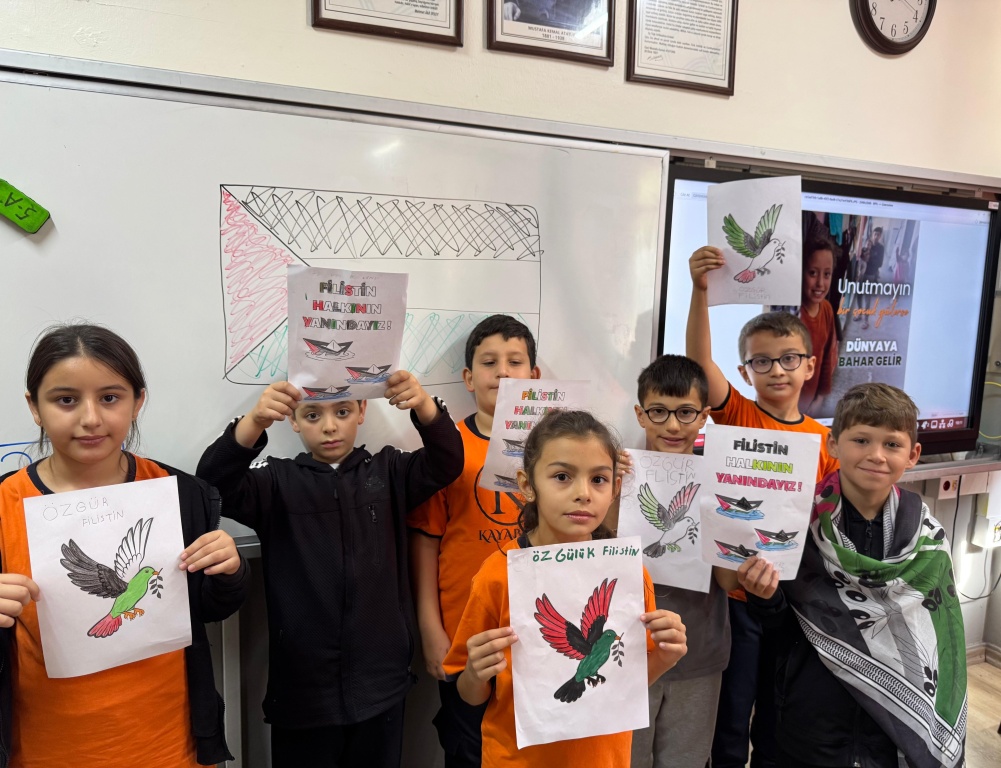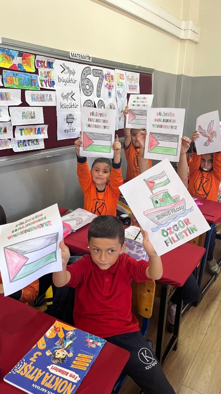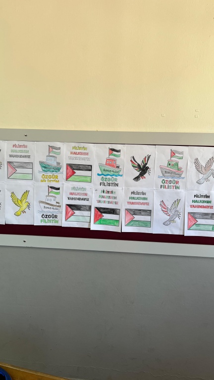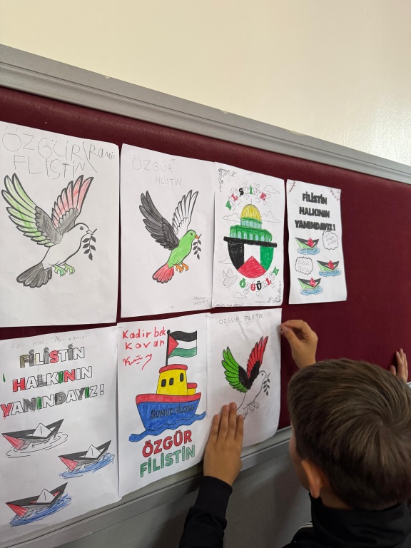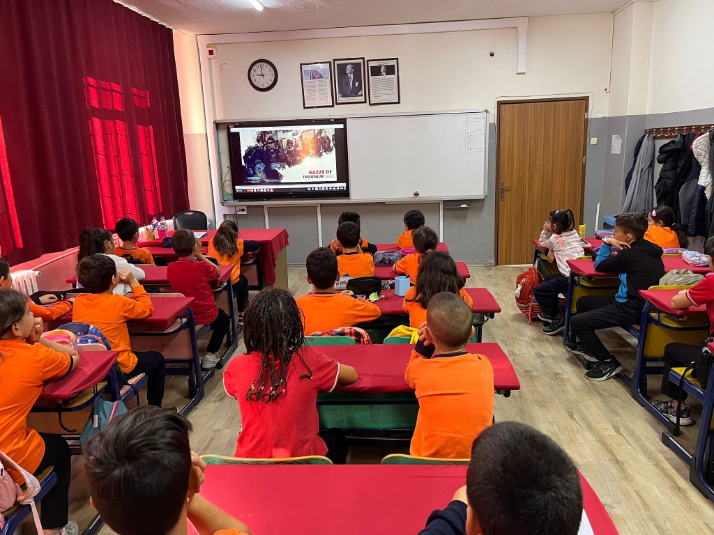 Filistin ve Gazze'de yaşanan acılara duyarsız kalmamak, insanlık onurunu savunma bilincini çocuklarımızda yaşatmak amacıyla 7 Ekim Salı Günü ikinci ders saatinde tüm öğrencilerimize "Filistin Farkındalık Eğitmi" videosu izletildi. Ardından öğrencilerimiz etkinlik yaptılar. Yaptıkları etkinlikleri sınıf panolarında sergilediler.
